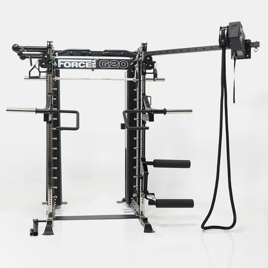 The next evolution in Force USA’s G-series, the G20 Pro™ All-In-One Trainer is the most complete, compact trainer ever built. Combining a commercial-grade Functional Trainer, Smith Machine (450kg), Power Rack, Chin Up Station and Leg Press, with 30 attachments and updated features including a Swing Arm and 2:1 Cable Ratio, this machine is impossible to beat. Designed and engineered in our professional training labs, this beast is made with unbelievably tough, heavy-duty, high tensile steel. Your strength training is about to enter a whole new world!